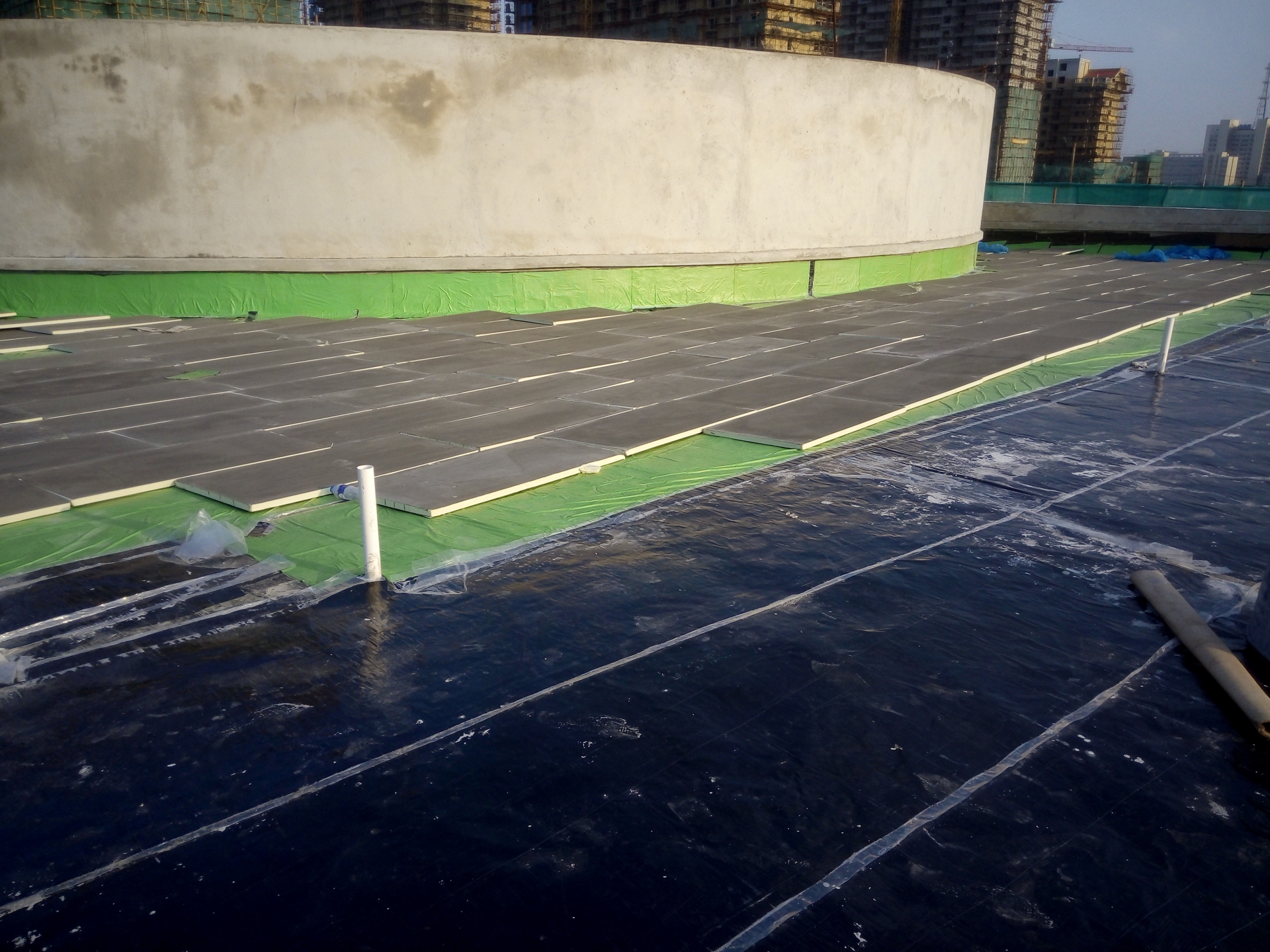 平面和立面部位的防水层施工完毕并经检查验收合格后,宜在防水层上虚铺一层沥青防水卷材做保护隔离层,铺设时宜用少许胶粘剂固定,以防在浇筑细石混凝土刚性保护层时发生位移。保护隔离层铺设完毕,即可浇筑40~50mm厚的细石混凝土保护层。在浇筑细石混凝土的过程中,切勿损失保护隔离层和卷材防水层。如有损失必须及时对卷材防水层进行修补,修补后再继续浇筑细石混凝土保护层,以免留下渗漏隐患。